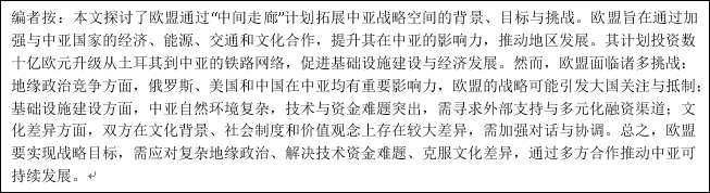对全球地缘政治格局的影响。欧盟“中间走廊”计划对全球地缘政治格局有深远影响。在欧亚地区,欧盟战略调整改变交通和能源运输格局,使中亚成为连接欧洲、亚洲和中东的重要桥梁,提升欧盟和中亚在全球地缘政治中的地位。在全球能源市场,中亚能源资源通过“中间走廊”更有效输往欧洲,助欧盟实现能源供应多元化,降低对俄罗斯能源依赖,增强能源安全,同时推动中亚国家能源多元化,提升其全球能源市场地位。在国际事务中,欧盟与中亚国家合作使欧盟获得更多合作伙伴和更大话语权,更好应对全球性挑战,推动构建平衡稳定的国际秩序。