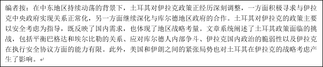 过去五年,土耳其对伊拉克的政策以双轨战略为主。土耳其在与库尔德地区政府的合作基础上,增加了与伊拉克各方的合作,投资外交和军事工具。这虽使土耳其在局势变化时更从容,但也有局限性,土耳其维持这一战略的能力将取决于其驾驭区域联盟、管理内部政治动态以及平衡在伊拉克的参与和更广泛的地缘政治限制的能力。