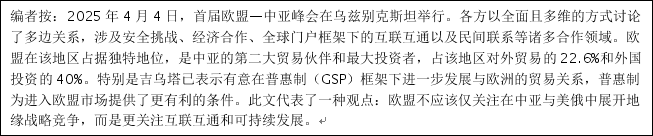 2025年4月4日,首届欧盟—中亚峰会在乌兹别克斯坦举行,强调了欧盟通过互联互通、经济多元化和获取关键原材料加强与中亚联系的努力。欧盟期望采取更全面、符合地区特点的战略,超越大国竞争,促进包容性和长期伙伴关系,增强其在中亚地缘政治格局中的建设性和互补性行为者角色。