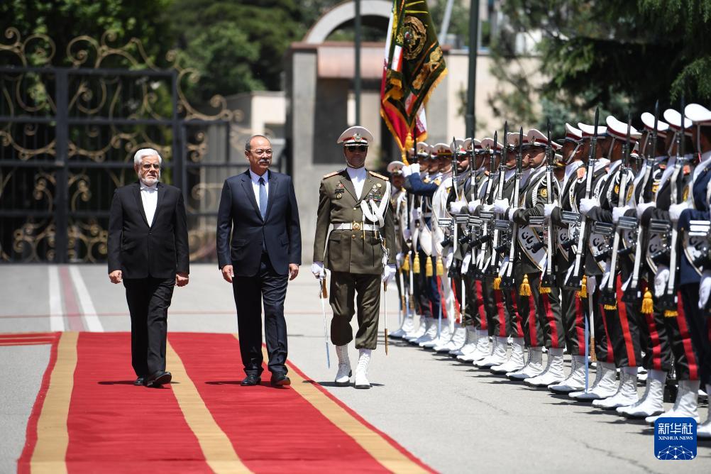 (5月11日,在伊朗首都德黑兰,伊朗第一副总统阿雷夫(左一)与到访的乌兹别克斯坦总理阿里波夫(左二)在欢迎仪式上检阅仪仗队。)